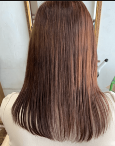 3.初回来店から約11か月目。ブラシ、ストレートアイロンなどは一切使用しておらず、この頃の施術内容は同じようにヘナの繰り返しと、酸性縮毛矯正をしています。ご来店当初の傷みの部分は毛先15センチは残っていますが見た目は艶が出てかなりキレイになりました。お客様自身も髪にハリコシが出たのを感じていただき、「ホンマにこんな風になるんやね」と涙を流されて喜んでいました。