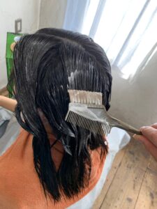 ③Hareluのダメージレスカラーと髪質改善トリートメントのカウンセリングが完了し次第、トリートメントの施術スタートとなります。元の状態に対して必要な髪質改善トリートメントを独自にブレンドし、特に気になる個所にトリートメントを入れ込んでいきます。髪に浸透させ、温めながらお時間を置きます。縮毛矯正と違い、トリートメントなので「クセを伸ばす」という感覚よりも、髪の乾燥を取り除き、まとまらないパサパサを抑え、髪をまとまりやすくしていきます。