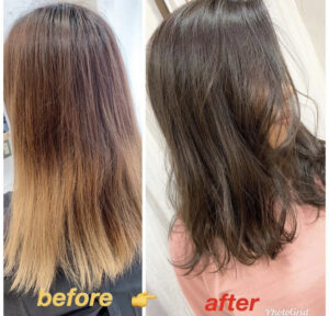 ⑧お仕上がり。抜けきっていた髪色からサラサラで艶の出る髪に仕上がりました。髪質の改善は数回にわたって行うことでよりきれいになり、理想の髪質に近づけることが出来ます。数度にわたっての改善が難しい場合は、一度でクセや広がりを抑えることができる縮毛矯正メニューがおすすめです。