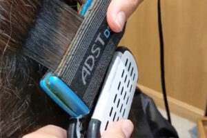 ⑤髪を乾かし、トリートメントが髪の中心付近に残っている状態で、アイロンの熱をゆっくりと入れていきます。これにより、トリートメントが髪の内部のたんぱく質の歪みを整え、傷んでパサパサになっている髪を引き締めてくれます