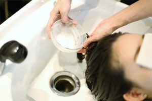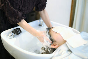 ⑦ご希望の色味に近づいていることを確認し、シャンプー台でシャンプーと、アフタートリートメントを行います。サラサラで、きれいな髪色を維持するために必要な工程です。